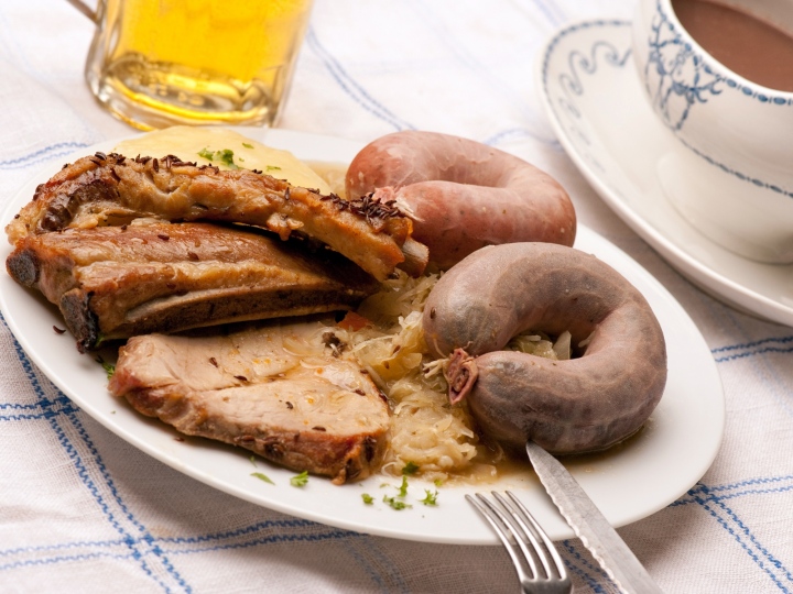 Schlachtplatte, Kesselfleisch mit Kraut, Blut- und Leberwurst, Schnitzel mit Pommes, schwäbische Maultaschen (auch vegetarisch) mit Kartoffelsalat